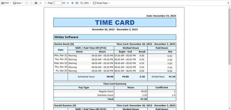 Generate reports for time cards, average working hours, missing registrations, actual vs adjusted registration or modification logs, and more. Reports can be printed or exported to PDF or Excel